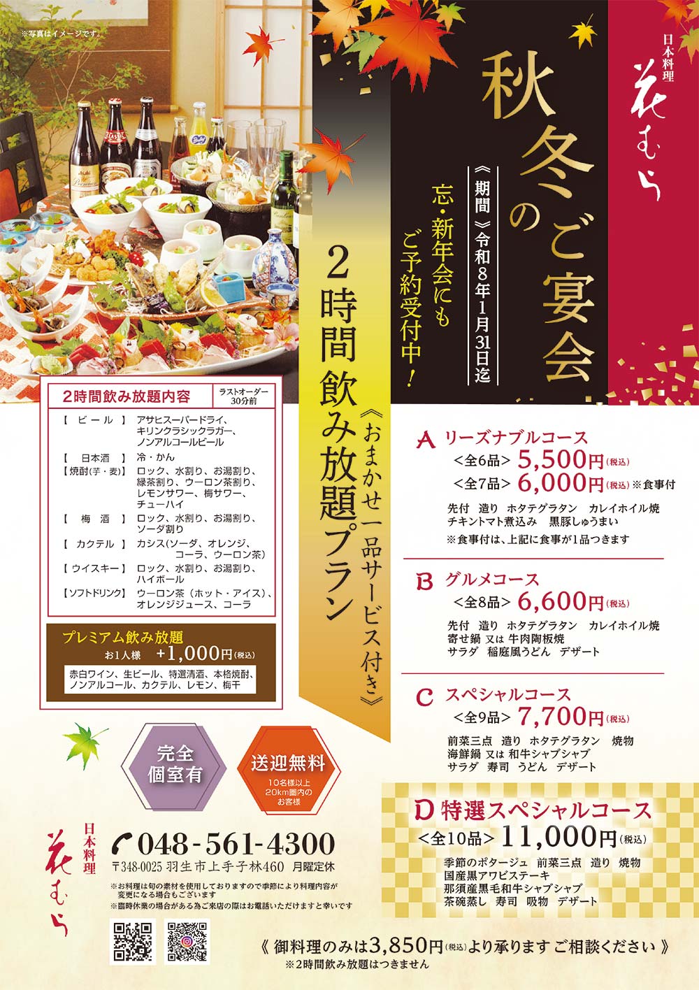 秋冬のご宴会予約受付中です2026年1/31まで ※クリックで拡大画像が表示されます 葬儀・法事のお弁当のご注文承ります 個室のご案内 ランチ 滋味あふれる会席ランチ膳と定食。 ディナー 四季折々の旬な食材を使ったお料理をご提供 葬儀・法事コース 偲ぶこころ、感謝の「ありがとう」をかたちに。 法事弁当 初七日・四十九日・三回忌・七回忌・お通夜などの会食に。 求人情報 会席コース 四季を存分に味わう花むら自慢の季節会席。 祝事コース 慶びの日を彩る、花むらの祝事料理。 お子様料理 お子様向けのお料理をご用意しております。 お持ち帰り弁当 花むらがまごころ込めてお作りするお弁当 求人情報